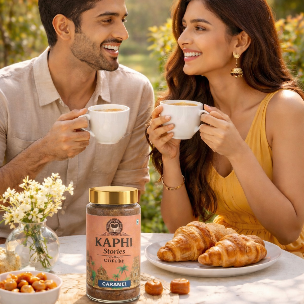 Introducing Kaphi Stories Caramel Coffee - a decadent blend that combines the richness of South Indian coffee with the sweet, buttery notes of caramel. This luxurious coffee is perfect for creating moments of warmth and comfort, making it a true indulgence to be savored. The smooth and creamy texture of the caramel flavor provides a unique and delightful twist to your everyday coffee experience. Whether you enjoy it as a morning pick-me-up or a mid-day treat, Kaphi Stories Caramel Coffee is sure to become a beloved part of your daily routine. Indulge in the irresistible combination of rich coffee and sweet caramel with every sip of Kaphi Stories Caramel Coffee.